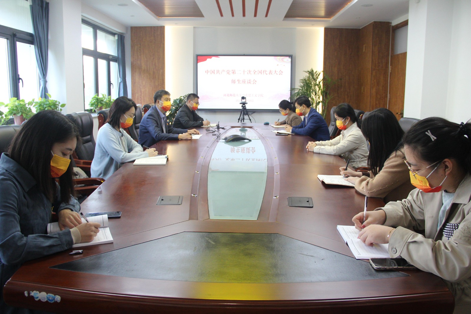 在聚精会神收看大会盛况、认真聆听大会报告后,大家心潮澎湃、备受鼓舞。学院立即在330会议室召开师生座谈会,会议采用线上线下相结合的方式,学院领导班子、系主任、教研室主任、教师代表、辅导员、学生代表共计50余人参加了会议。会上,师生积极交流学习心得,并展开了热烈的研讨。