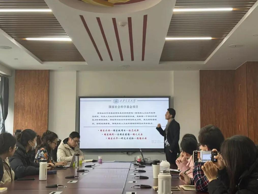 刘占虎教授首先就国家社会科学基金项目的国家定位和时代关切做了分析,并以近两年国家社科基金立项情况及学科分布特点为切入点,指出国家级项目的选题要从国家水准出发,立足国家视野,展现国家水平,体现申报者研究力的进阶。其次,阐明良好的选题是课题申报的前提条件,善于处理好创造性读书与高品质积累的互成关系。以饱满的治学精神持之以恒耕读经典,主动开拓思维世界,敢于走出理论研究中的“二手思维”,通过长期积累形成“高垂直度”的研究领域。刘老师借助典型案例重点阐述课题申报书的撰写规范和常见问题,其中强调高质量和前瞻性选题要突出学科特色,善于聚焦个人研究所长、深耕厚植,扬长补短,争取从同质化文本中脱颖而出,反复磨砺申报书形成体现“国家水准”的论证能力。最后,鼓励在场的师生要学会养成攻坚克难的学者韧性,勇于做好选题积累和项目申报的节点规划,保持学术成果产出与各类项目申报同步推进,以平常心态问道治学,厚积薄发。