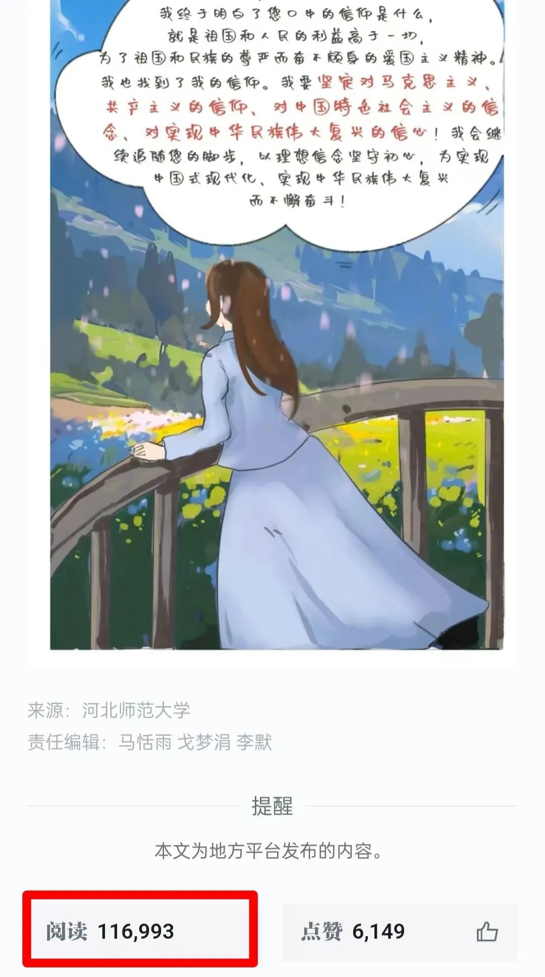 心中有信仰,脚下有力量。作品《信仰·信念·信心》采用手绘漫画的形式,以抗美援朝精神为切入点,生动讲述了一个青年以抗美援朝老兵为榜样,在学习、研究、传播、践行马克思主义的过程中,坚守信仰、坚持信念、坚定信心,逐渐成长为一名青年马克思主义者的故事。起到了引导广大青年坚定对马克思主义、共产主义信仰,对中国特色社会主义的信念,对实现中华民族伟大复兴的信心的良好育人效果。该作品于2023年12月2日以《学思践悟|手绘长图:信仰·信念·信心》为题在学习强国发表,阅读量116993,点赞量6149;于11月29日在新葡萄8883官网AMG微信公众号发表,阅读量5199,点赞量121。