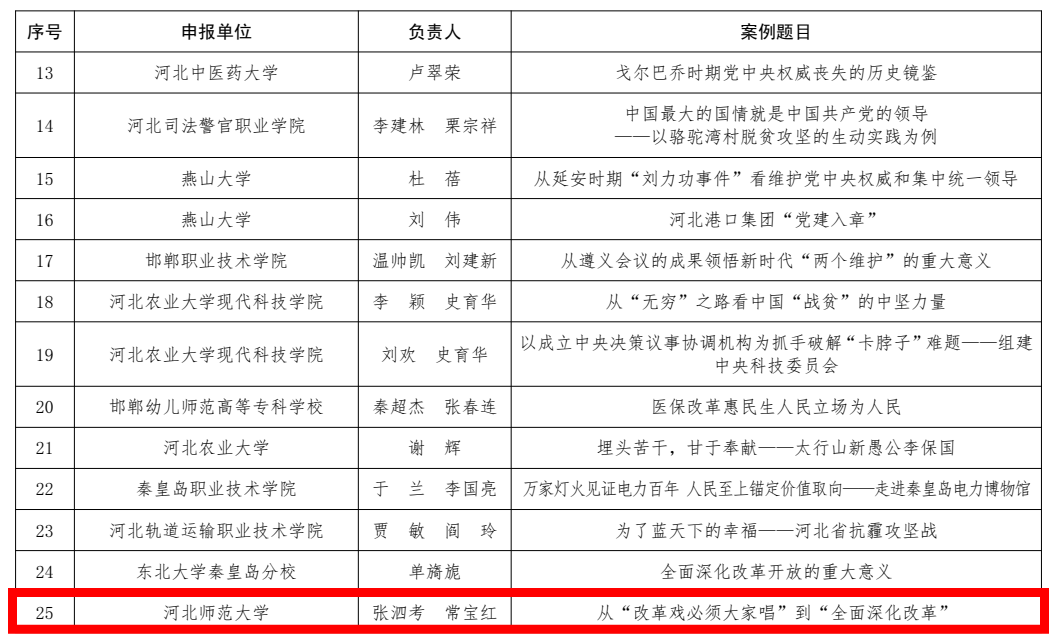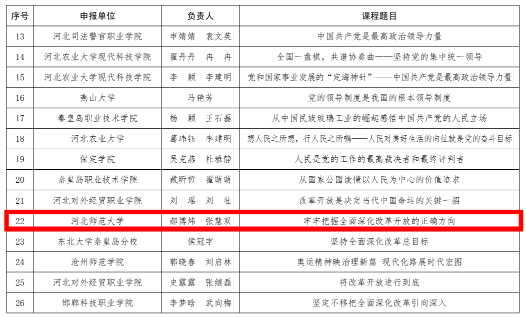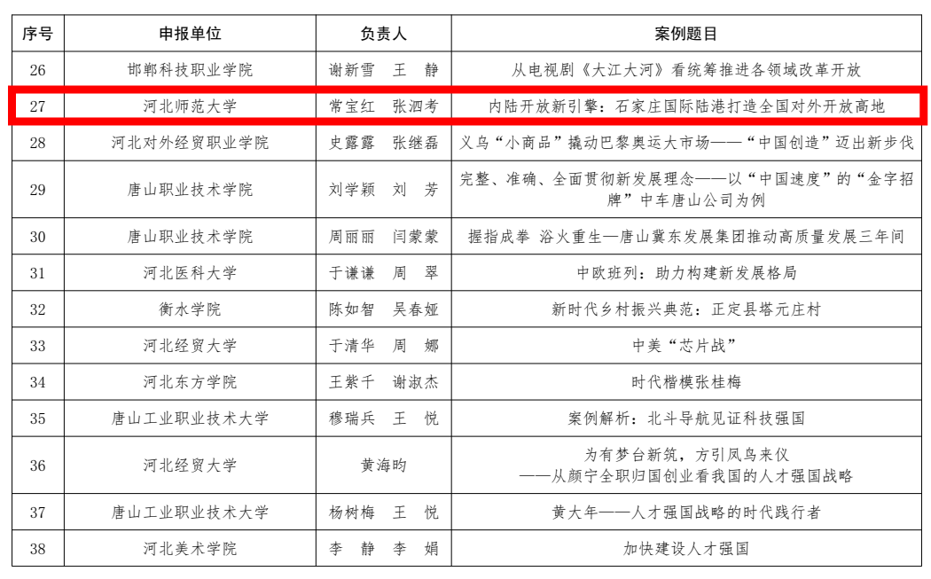 青年思政课教师郝博炜、张慧双携手打造的课程《牢牢把握全面深化改革开放的正确方向》入选“习近平新时代中国特色社会主义思想”精品视频课(大学组);教研室主任常宝红、张泗考合作的教学案例《从“改革戏必须大家唱”到“全面深化改革”》和《内陆开放新引擎:石家庄国际陆港打造全国对外开放高地》入选“习近平新时代中国特色社会主义思想”优秀教学案例(大学组)。