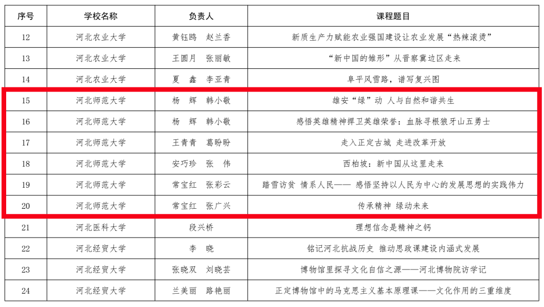 新葡萄官网报送参加评选的7项思政课实践教学精品课全部入选河北省思政课实践教学精品课。7项思政课实践教学精品课分别是:马克思主义基本原理教研室杨辉、韩小敬创作的《雄安“绿”动 人与自然和谐共生》和《感悟英雄精神捍卫英雄荣誉:血脉寻根狼牙山五勇士》,中国近现代史纲要教研室王青青、葛盼盼创作的《走入正定古城 走进改革开放》,形势与政策教研室安巧珍、张伟创作的《西柏坡:新中国从这里走来》,习近平新时代中国特色社会主义思想概论教研室常宝红、张彩云创作的《踏雪访贫情系人民——感悟坚持以人民为中心的发展思想的实践伟力》和常宝红、张广兴创作的《传承精神 绿动未来》,思想道德与法治教研室杜成斌创作的《追寻领袖足迹 感悟人民情怀》。